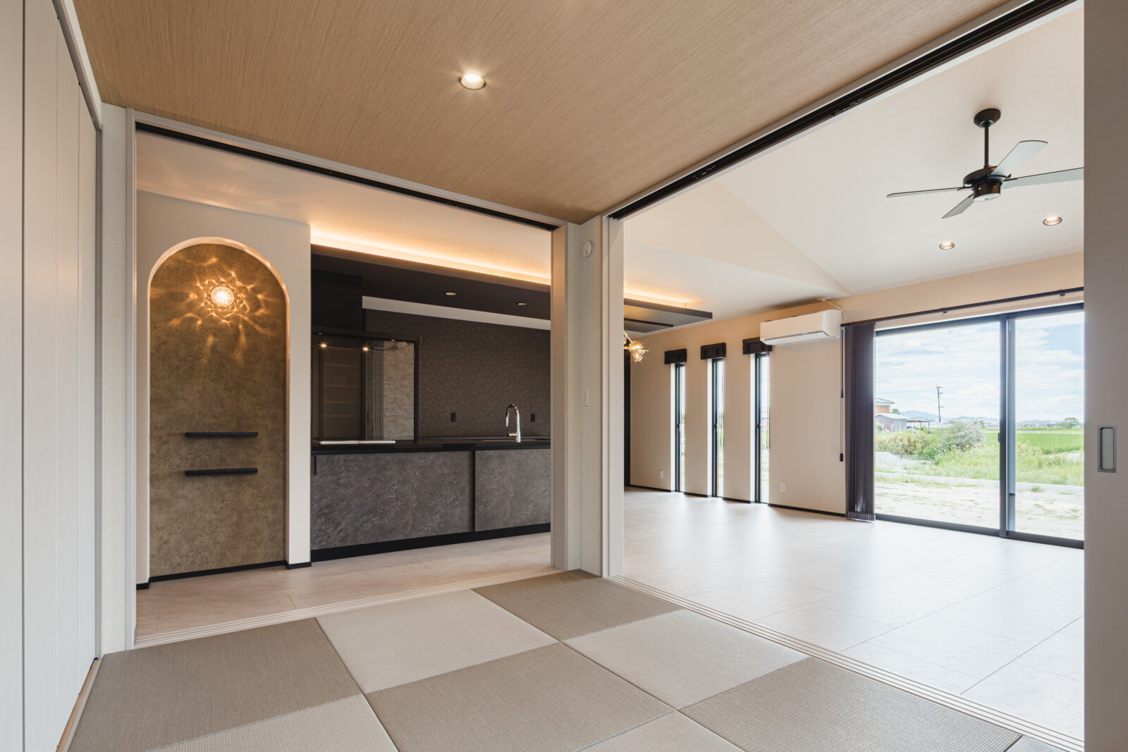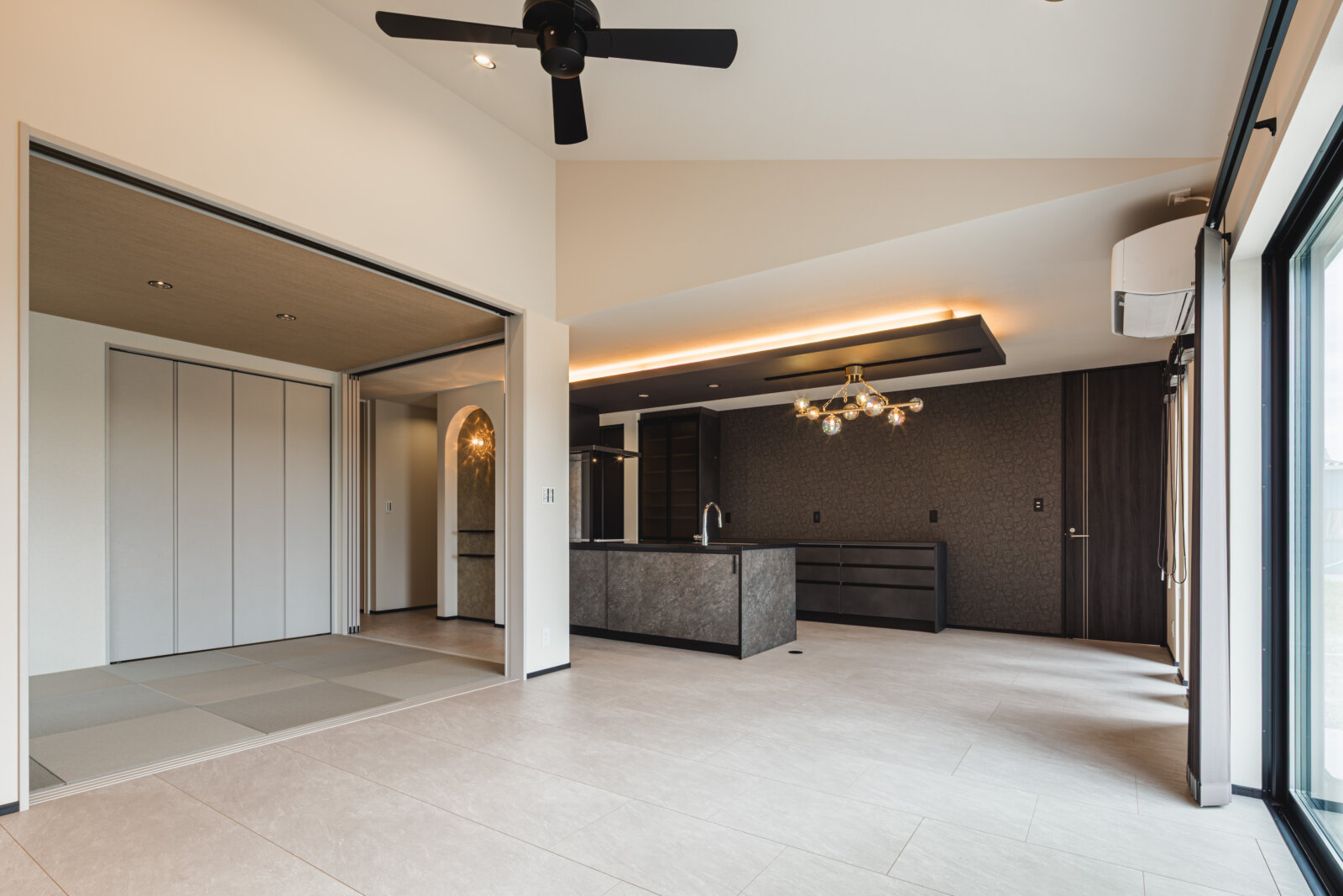 ホワイトとグレーのホテルライクなリビングに和の空間をリンクさせた贅沢な空間が日常の喧騒を忘れさせてくれます