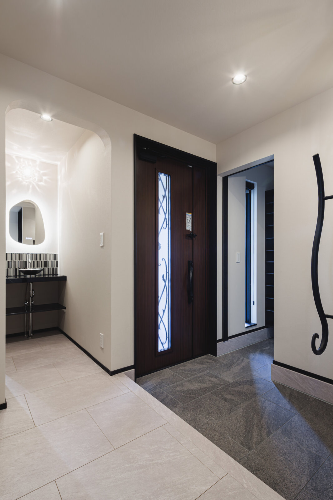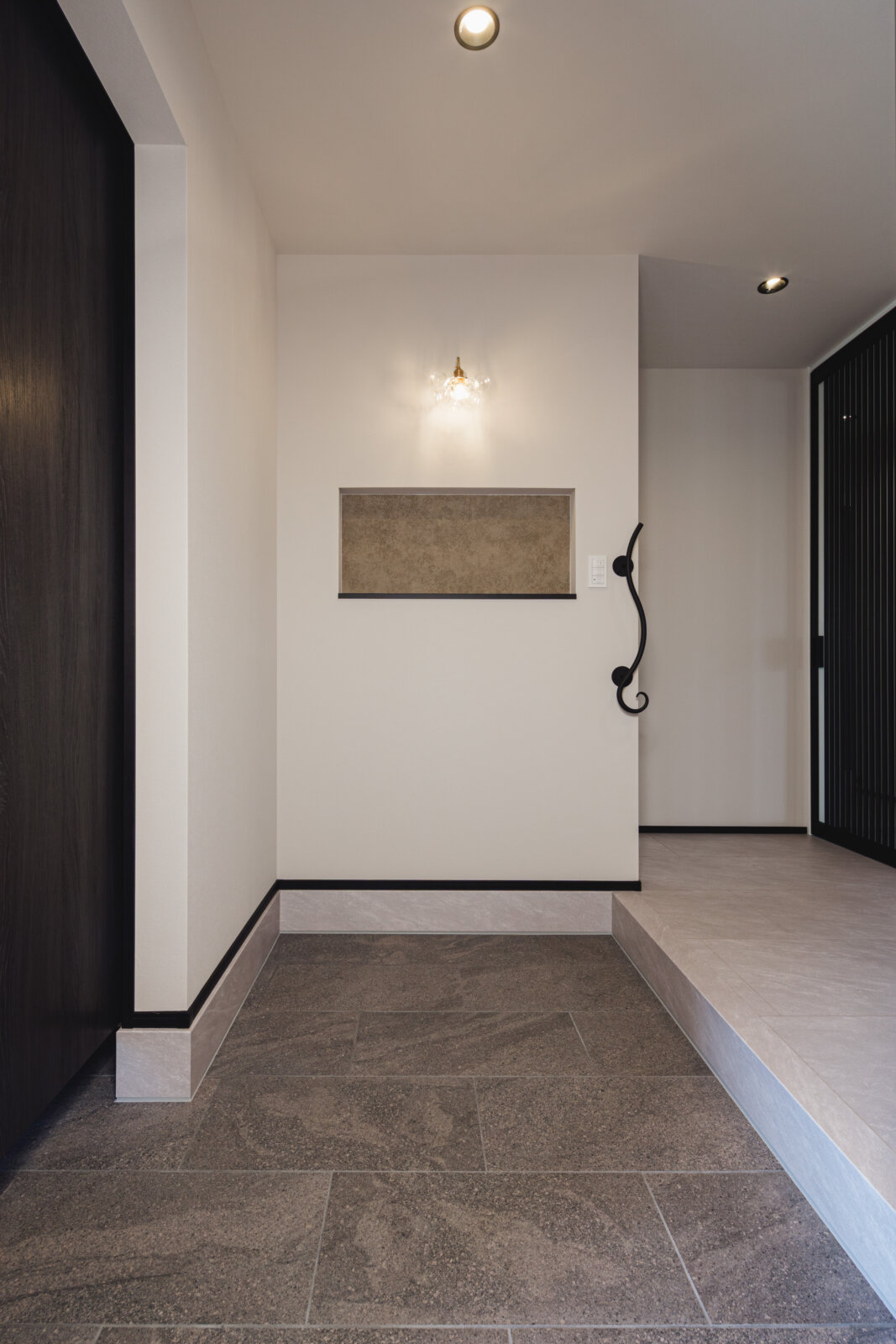 エントランスにはグレーのニッチを設けることでおもてなしの空間に