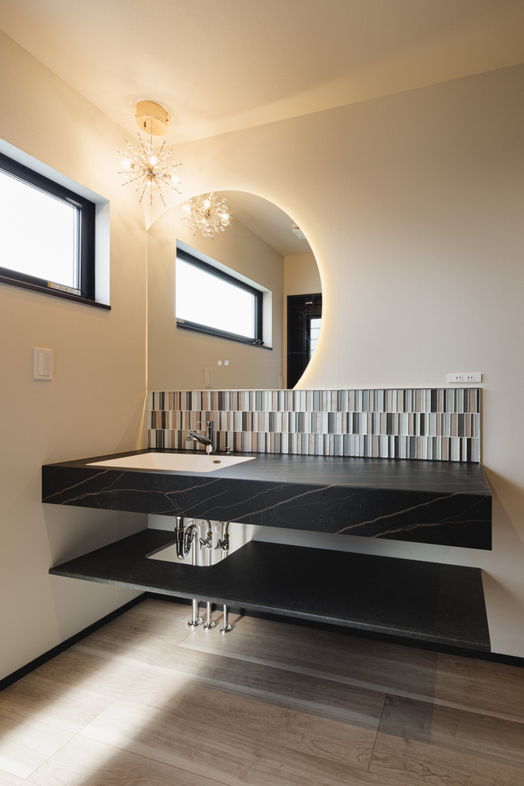タイルとミラー照明がリゾート感のあるドレッサーを演出します