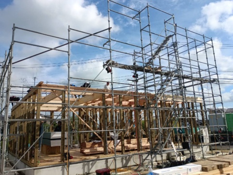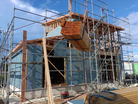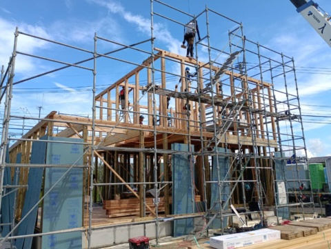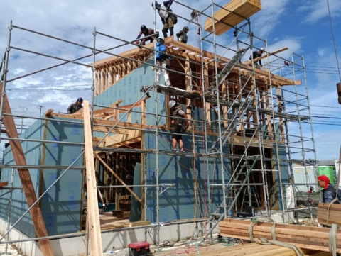 1階部分には「緑の柱」を使用し、防腐、防蟻、耐久性に優れたお家つくり。大工さん達のチームワークの良さにより屋根まで出来上がりました🙌