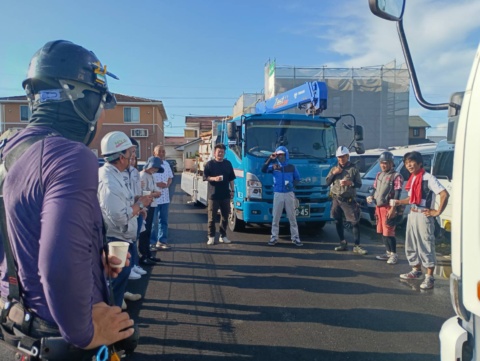 お施主様と工事関係者さんのご挨拶のあと乾杯し、いよいよ上棟の始まりです!