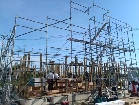 足場も組まれ準備万端。お施主様に建物の四隅に酒、塩をまいて浄めていただきました✨