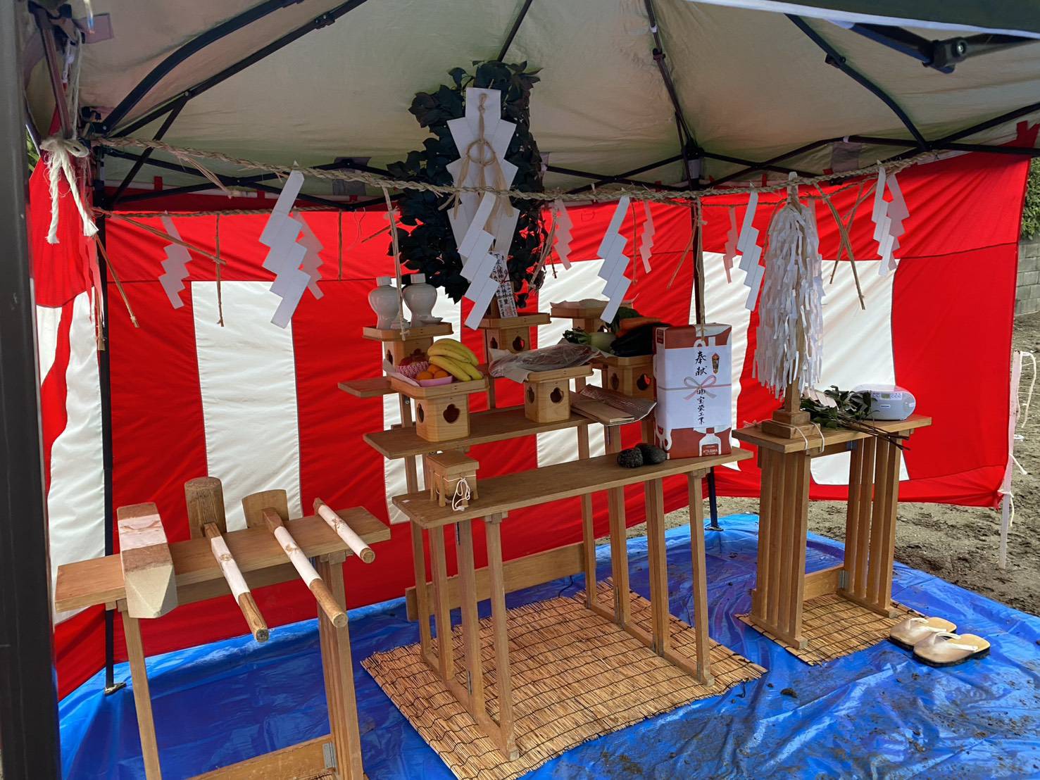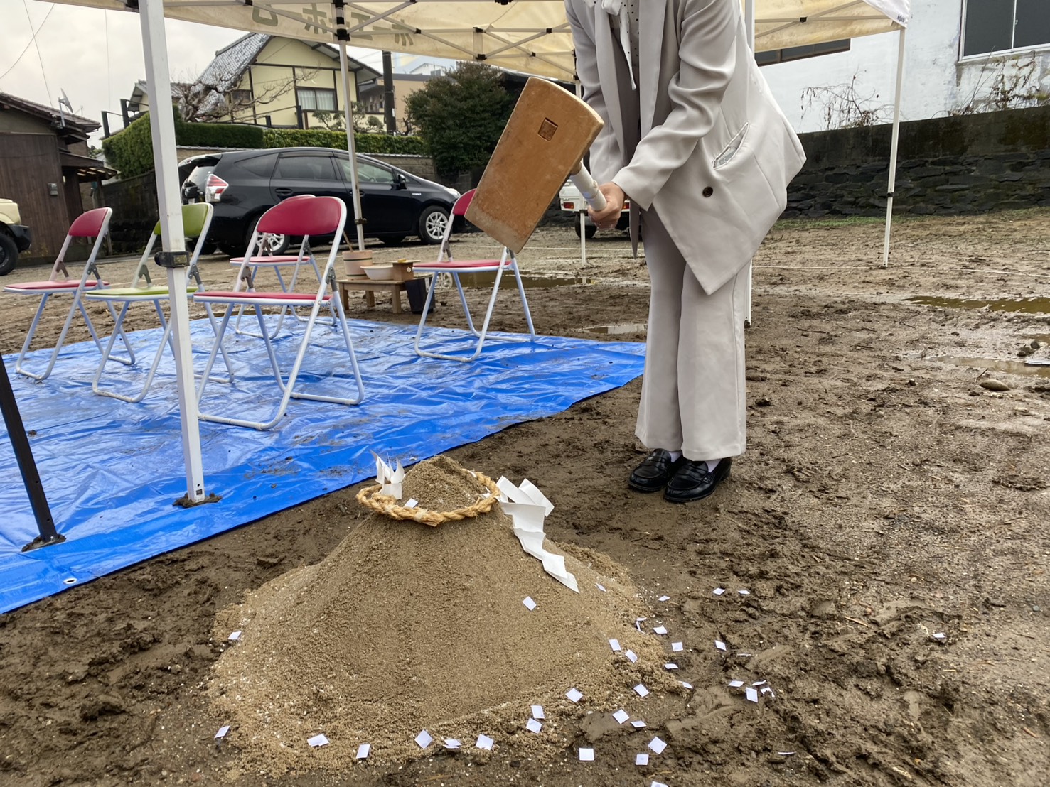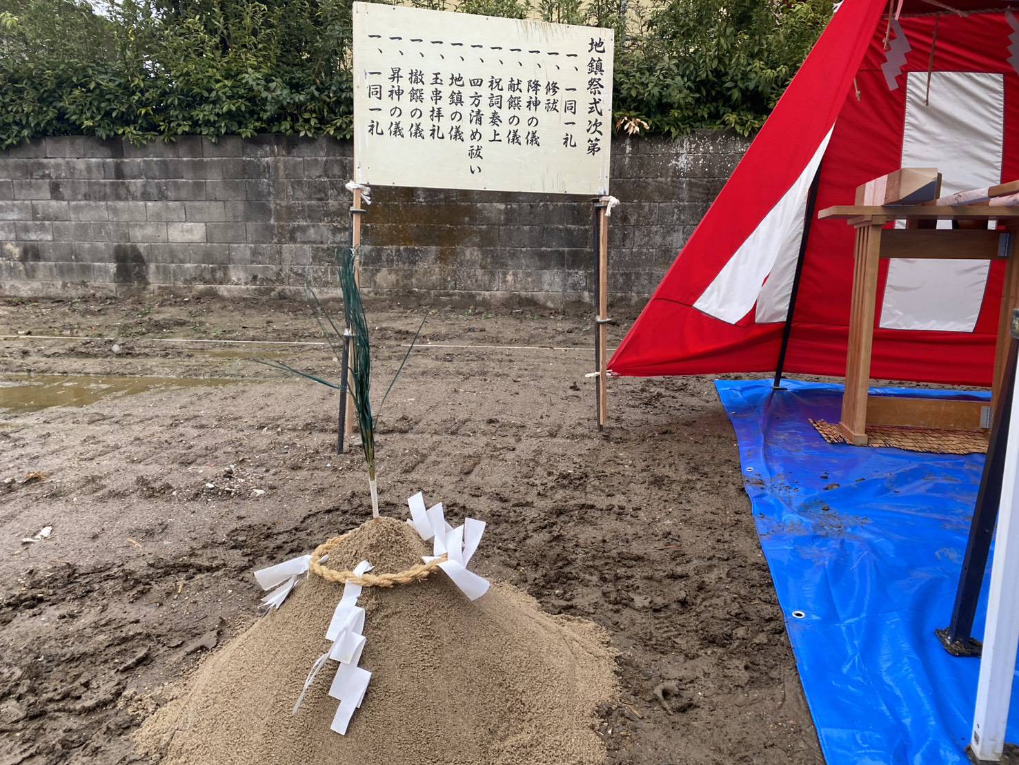 前日の雨でブルーシートを張っての地鎮祭になりましたが、雨が降ることで土地が固まり、建物の基礎が安定するという意味合いがあり縁起が良いとされています👍