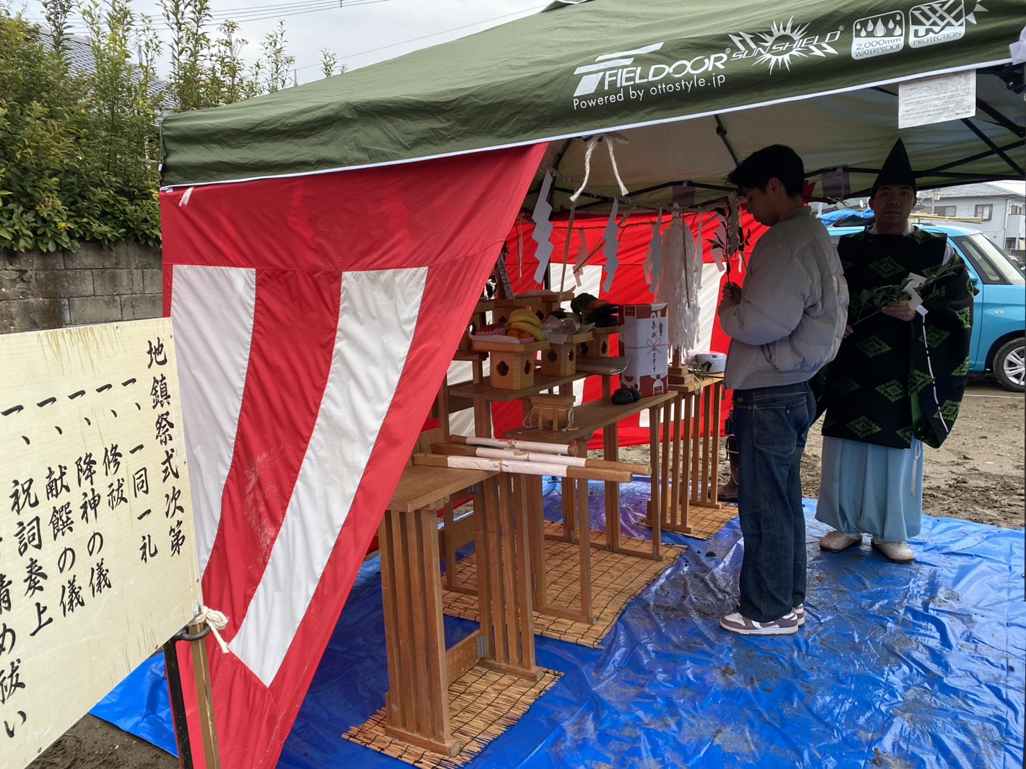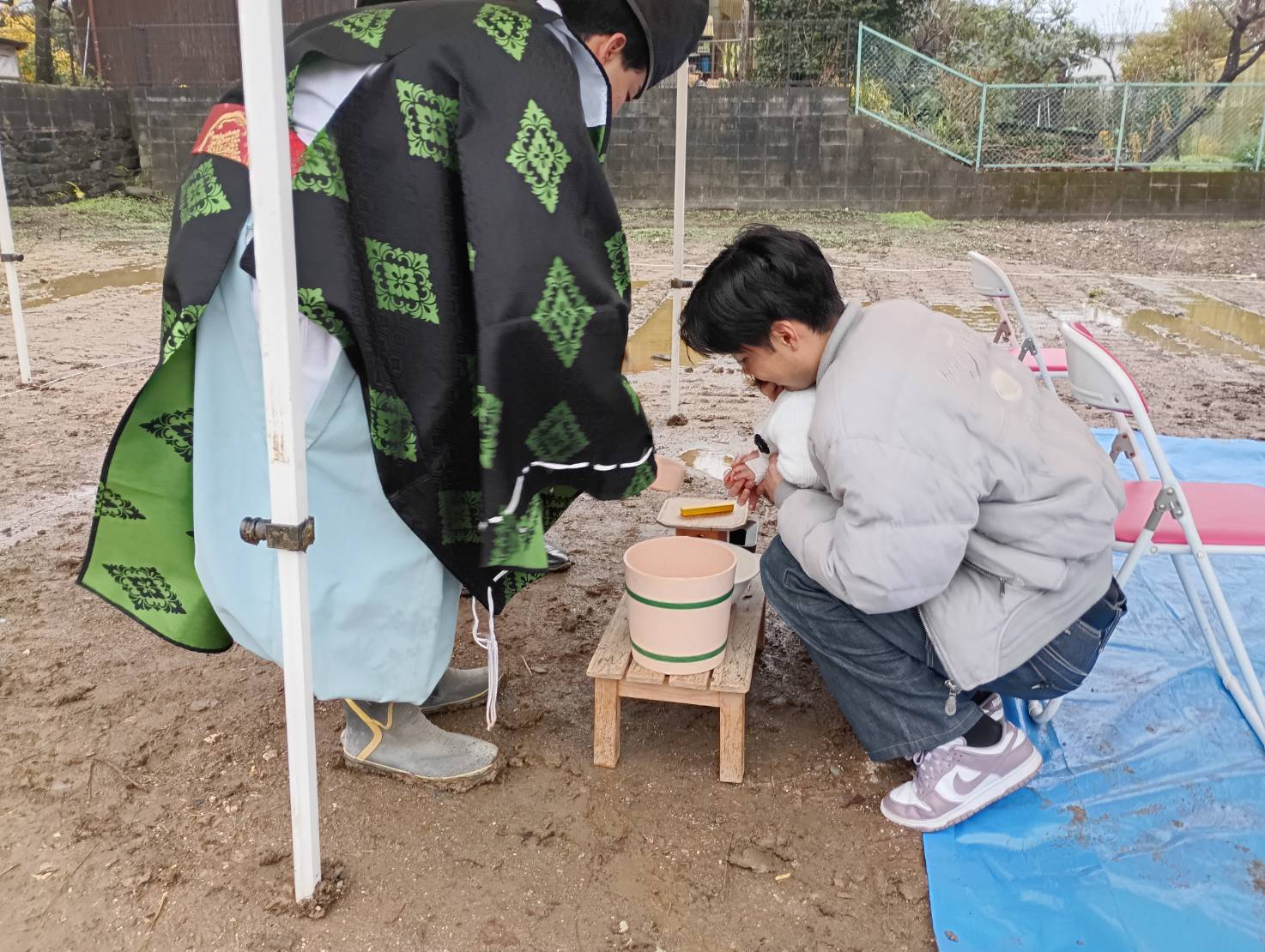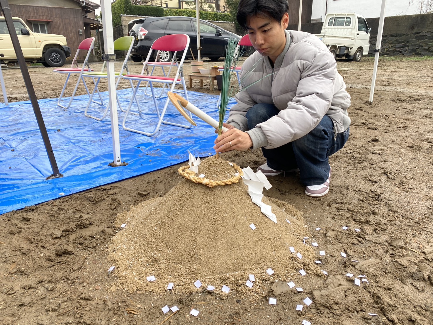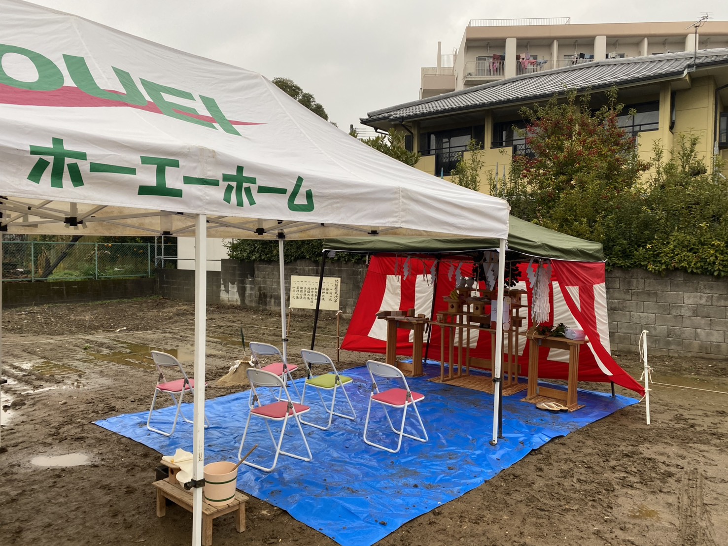 前日の雨でブルーシートを張っての地鎮祭になりましたが、雨が降ることで土地が固まり、建物の基礎が安定するという意味合いがあり縁起が良いとされています👍