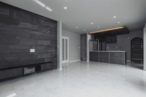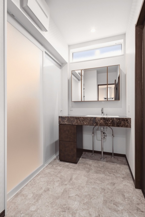3種類のグレー系外壁を貼り分けコーディネートした外観 シューズクローク横に手洗いカウンターを設置。帰宅後すぐに手洗いができます。 玄関…
