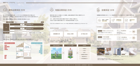 ◎品質に自信があるからこそ、建物20年の品質保証を実現。 保証期間が長くても、有償メンテナンスの回数が多いと住宅維持のコストが増加します。私たちは引き渡しから構造躯体・防水の初期保証20年を保証します。「建ててから」本当のお付き合いのはじまりです。 ◎毎日の暮らしの中で消耗していく住宅設備にも10年保証を実現。 キッチン・バス・給湯器・洗面台・ウォシュレット。毎日の生活で利用される場所であり機器です。私たちは引き渡しからこの設備にも10年保証します。メーカー保証同等のサービスを24時間365日のコールセンターで充実のサポート体制でご提供します。 ◎安心の暮らしは足元から。地盤保証も20年保証を実現。 私たちは地盤保証20年を実現し、長期にわたる安心と信頼をお届けします。地盤沈下など万が一のトラブルにも万全を備えたサポート体制。お客様の大切な住まいをしっかりと支え続けます。